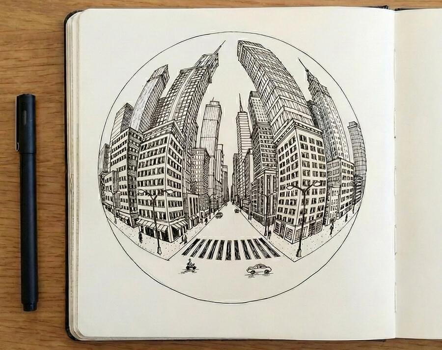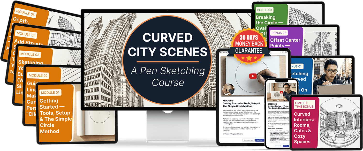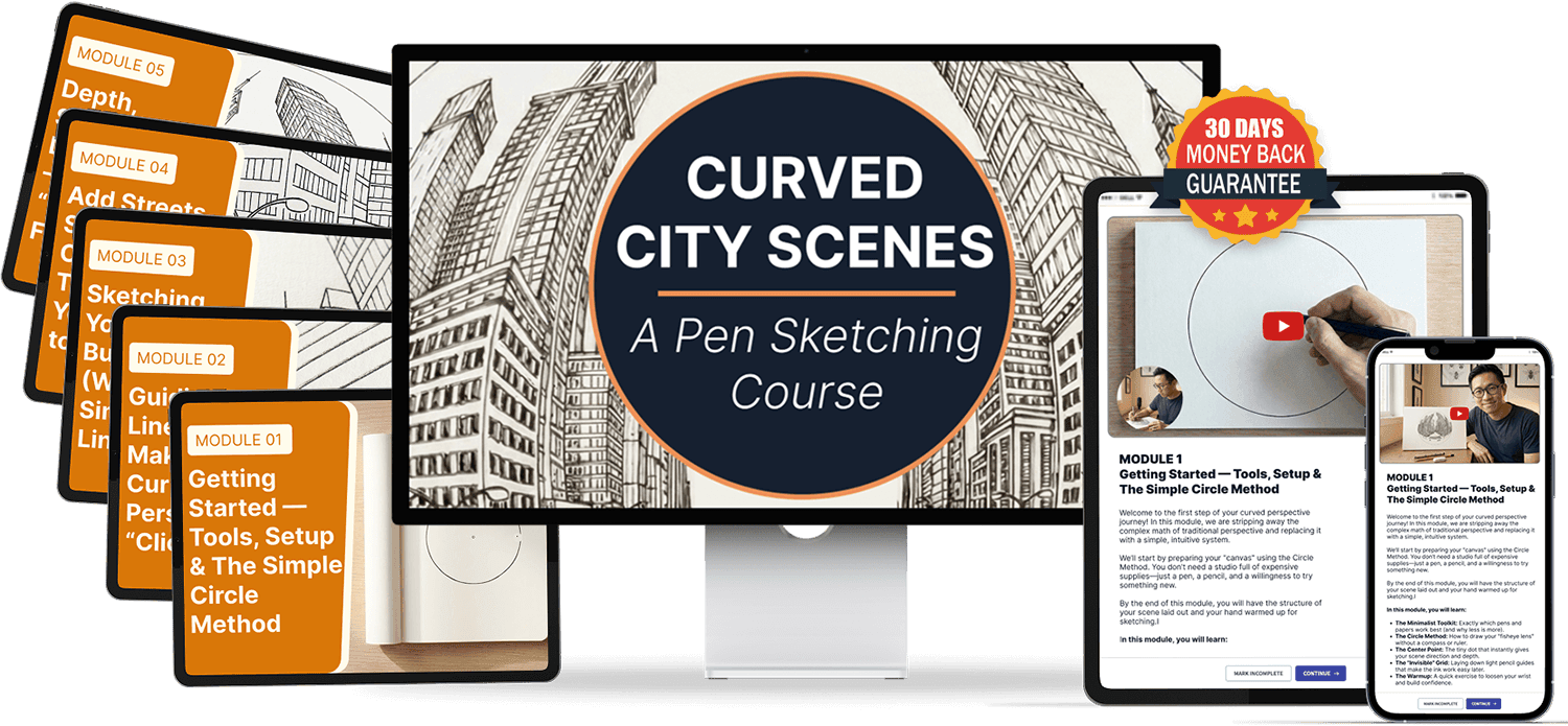 A step-by-step course that teaches you how to create dramatic, sweeping curved city scenes using just a pen — even if you’ve never drawn perspective before.