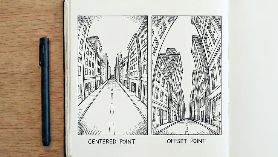 • The simple “center shift” trick that instantly changes your viewpoint — so your sketch can feel higher, lower, or more dramatic