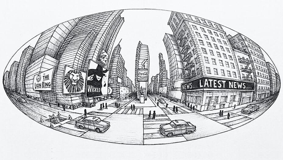Once you understand the simple structure behind curved perspective (also known as “fisheye”), you’ll sketch bold, dynamic city scenes with confidence… and love the process.